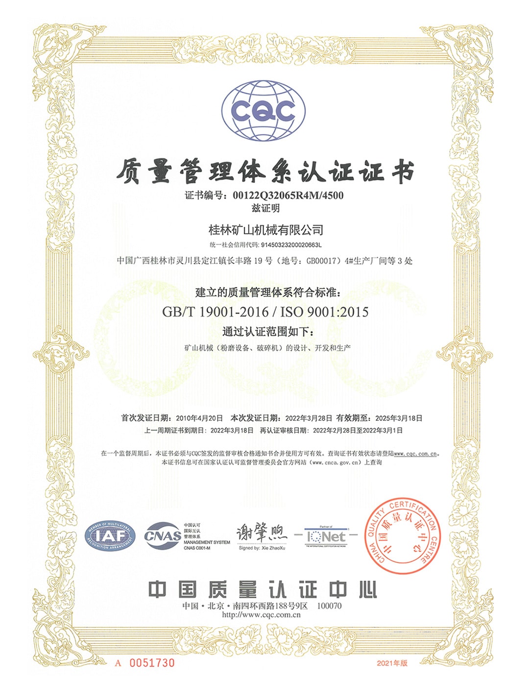 為使每一臺出廠的產(chǎn)品品質(zhì)得到保證,桂林礦機建有多條現(xiàn)代化先進設(shè)備生產(chǎn)線,以嚴(yán)謹(jǐn)?shù)墓芾砹鞒瘫U厦康拦ば蚨挤瞎に嚵鞒毯虸SO9001:2015質(zhì)量管理體系標(biāo)準(zhǔn),力求每一處細(xì)節(jié)都經(jīng)得起考驗,保證產(chǎn)品在各個制造階段的整體品質(zhì)。