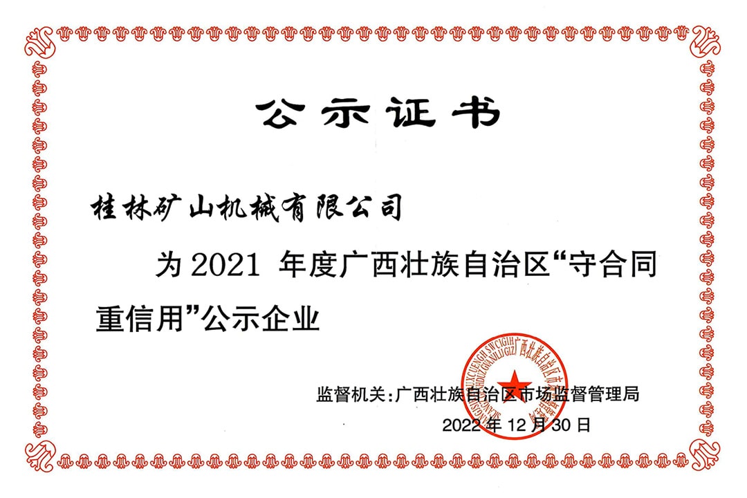 2022年末,自治區(qū)市場監(jiān)督管理局發(fā)布了《關(guān)于公示廣西2021年度“守合同 重信用”企業(yè)名單的通告》,桂林礦機憑借誠信的經(jīng)營理念和良好的市場信譽等優(yōu)勢,再獲“守合同 重信用”企業(yè)榮譽稱號。這份殊榮不僅是桂林礦機持續(xù)耕耘“以信為本”的努力付出的結(jié)果,更是桂林礦機“技術(shù)升級、研發(fā)升級、工藝升級、文化升級”的錘煉升級。