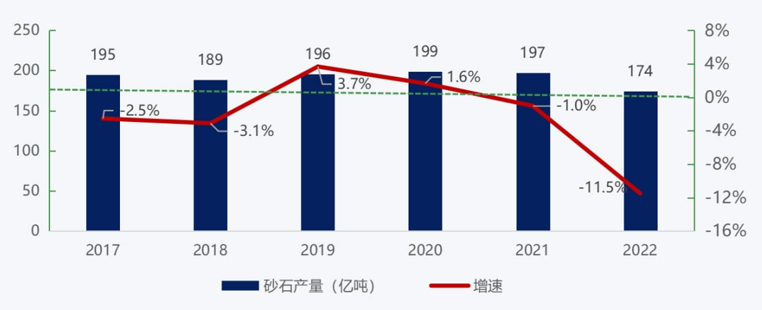 2022年砂石供需總體偏弱,供給端:產(chǎn)線開機(jī)率、產(chǎn)能利用率整體偏低;需求端:砂石需求收縮。從供需關(guān)系來看,2022年全年砂石處于供大于求的狀態(tài),企業(yè)庫存保持高位。全國砂石產(chǎn)量174.2億噸,較2021年下降11.5%。