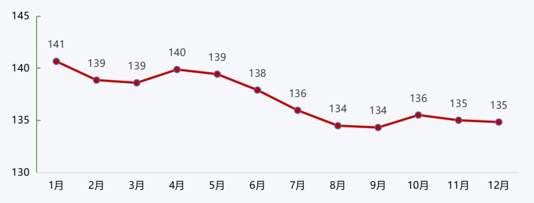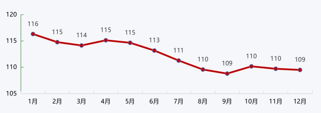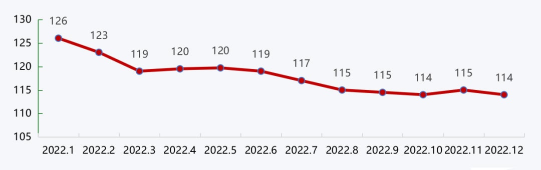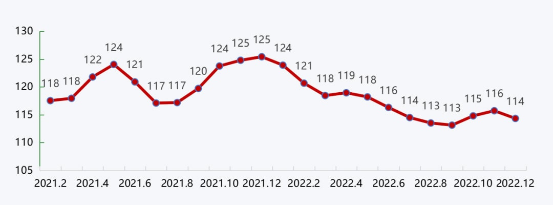 沿江城市砂石價格在年初高位運(yùn)行的基礎(chǔ)上,受到疫情封港、下游需求不佳、沿江運(yùn)費(fèi)高企等因素的影響,價格持續(xù)回落,進(jìn)入四季度,隨著施工旺季的到來,需求回升,價格也隨著略有回升。整體來看,2022年沿江港口砂石價格持續(xù)回落,12月降至114元/噸,較年初下降3.4%。