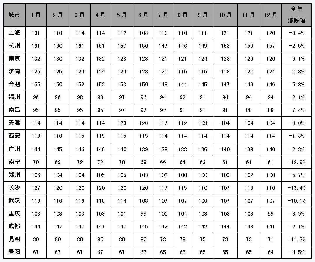 全國重點(diǎn)城市2022年砂石行情月度變化表(元/噸)