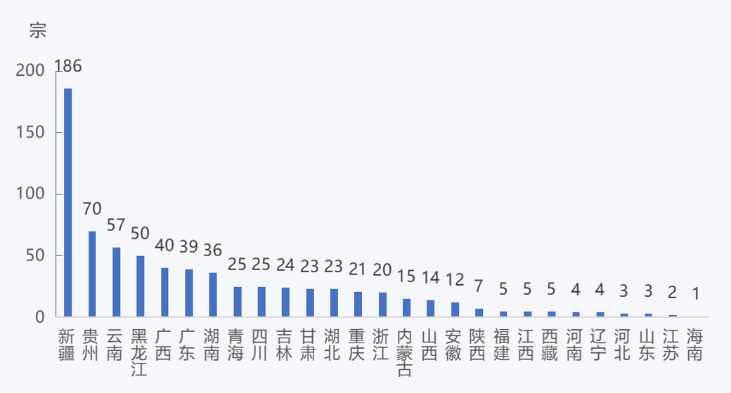 2022年,全國新設(shè)砂石礦權(quán)數(shù)量719宗,其中新疆新設(shè)砂石礦權(quán)數(shù)量最多,為186宗;貴州、云南、黑龍江新設(shè)砂石礦權(quán)數(shù)量為50~70宗;廣西、廣東、湖南新設(shè)砂石礦權(quán)數(shù)量為35~40宗;青海、四川、吉林、甘肅、湖北、重慶、浙江、內(nèi)蒙古、山西、安徽新設(shè)砂石礦權(quán)數(shù)量為10~25宗;陜西、福建、江西、西藏、河南、遼寧、河北、山東、江蘇、海南新設(shè)砂石礦權(quán)數(shù)量在10宗以內(nèi)。