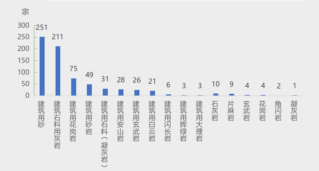 全國新設(shè)砂石礦權(quán)中,有建筑用砂、建筑石料用灰?guī)r、建筑用花崗巖、建筑用砂巖、建筑用石料(凝灰?guī)r)、建筑用安山巖、建筑用玄武巖、建筑用白云巖、石灰?guī)r、片麻巖、建筑用閃長巖、玄武巖、花崗巖、建筑用輝綠巖、建筑用大理巖、角閃巖、凝灰?guī)r17種礦種。其中建筑用砂、建筑石料用灰?guī)r兩類礦種新設(shè)數(shù)量最多,分別為251宗、211宗;建筑用花崗巖礦75宗;建筑用砂巖、建筑用石料(凝灰?guī)r)、建筑用安山巖、建筑用玄武巖、建筑用白云巖五類礦種新設(shè)數(shù)量在20~50宗;建筑用閃長巖、建筑用輝綠巖、建筑用大理巖三類礦種新設(shè)數(shù)量在10宗以內(nèi);另外,新設(shè)10宗石灰?guī)r礦、9宗片麻巖礦、4宗玄武巖礦、4宗花崗巖礦、2宗角閃巖礦、1宗凝灰?guī)r礦。