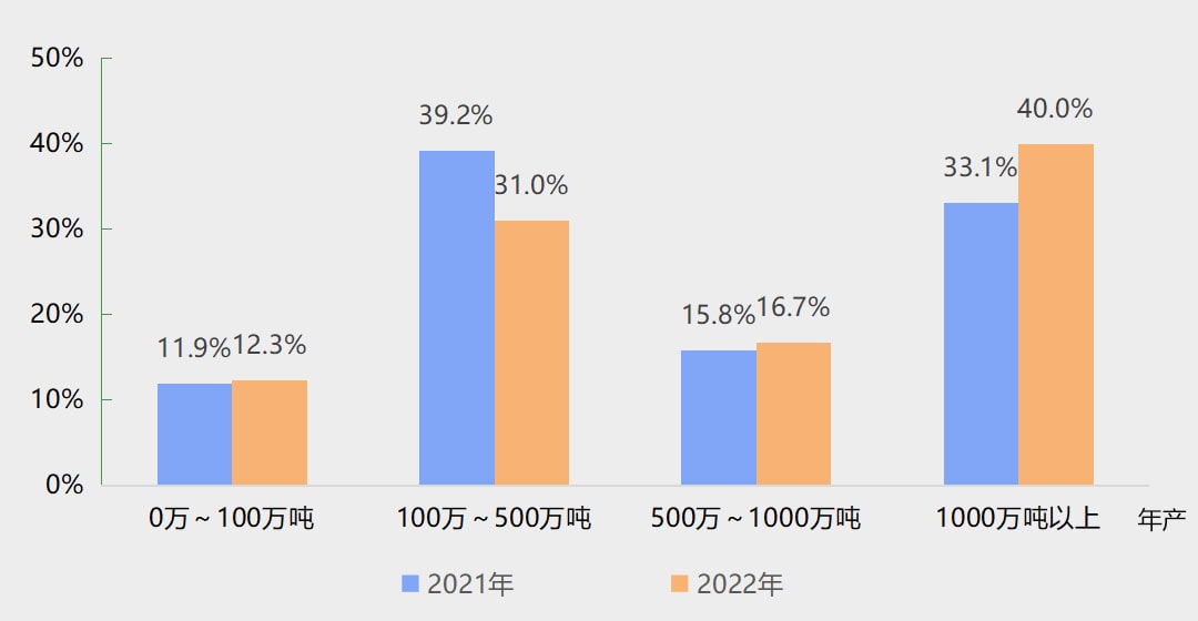 新設(shè)砂石礦權(quán)中,資源儲量大于1000萬噸的超大型砂石礦權(quán)、資源儲量在500萬~1000萬噸之間的大型砂石礦權(quán),占比分別提升至40.0%、16.7%,占比均較2021年有所提升。另外,資源儲量在100萬~500萬噸之間的中型砂石礦權(quán)占比為31.0%;資源儲量在100萬噸以下的小型砂石礦權(quán)占比為12.3%,中型、小型砂石礦權(quán)占比均較2021年有所下降。