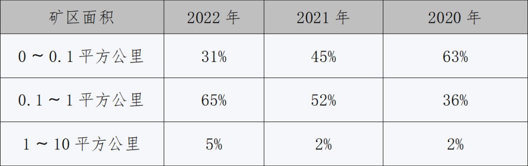 從新設(shè)砂石礦權(quán)礦區(qū)面積來看,砂石行業(yè)規(guī);竭M(jìn)一步提升,礦區(qū)面積0.1~1平方公里之間砂石礦權(quán)占新設(shè)砂石礦權(quán)六成以上,成為新設(shè)礦權(quán)的主流。新設(shè)砂石礦權(quán)中,礦區(qū)面積在0~0.1平方公里之間的有222宗,占比為31%,占比較2021年下降14個百分點(diǎn),新設(shè)小規(guī)模砂石礦權(quán)數(shù)量持續(xù)減少;礦區(qū)面積在0.1~1平方公里之間的新設(shè)砂石礦權(quán)有464宗,占比逐年提升,2022年已經(jīng)達(dá)到65%;礦區(qū)面積在1~10平方公里之間的新設(shè)砂石礦權(quán)33宗,占比為5%。