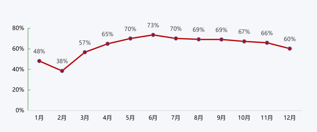 2022年砂石企業(yè)開機(jī)率和產(chǎn)能利用率走勢較為一致,均在年初、年尾出現(xiàn)回落,年中保持較高水平。一季度,受春節(jié)假期、雨雪天氣等影響,開機(jī)率、產(chǎn)能利用率均較低,2月更是分別降至38%、19%;二季度疫情逐漸緩解,三季度工程旺季到來,二、三季度開機(jī)率、產(chǎn)能利用率均保持較高水平,6月更是達(dá)到了年度最高水平,分別升至73%、39%;進(jìn)入四季度,受到雨雪天氣到來以及疫情的反復(fù),雙重因素的影響導(dǎo)致開機(jī)率、產(chǎn)能利用率均出現(xiàn)回落,12月,分別降至60%、35%。